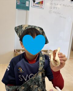 キャベツとウインナーを挟んでホットドッグ風にしたり、ハムとチーズにマヨネーズを合わせてハムチーズサンドにしたりと、子どもたちは思い思いの組み合わせを楽しんでいました。