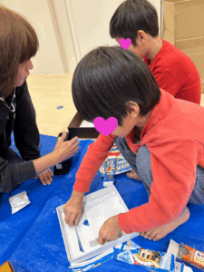 丸いものを箱にどうつけたらいいか、職員と相談しながら切り込みを入れたりと想像しながら切ってました。